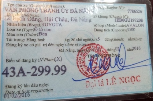 Giấy đăng ký biển số xe mà ông Nguyễn Xuân Anh đang sử dụng. |