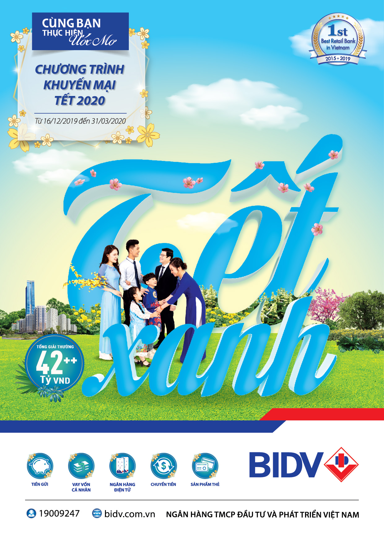 Nhằm tri ân khách hàng đã đồng hành cùng BIDV trong suốt năm vừa qua, Ngân hàng TMCP Đầu tư và Phát triển Việt Nam (BIDV) triển khai chương trình khuyến mại tổng thể sản phẩm dịch vụ “Tết xanh” với tổng giá trị quà tặng trên 42 tỷ đồng.