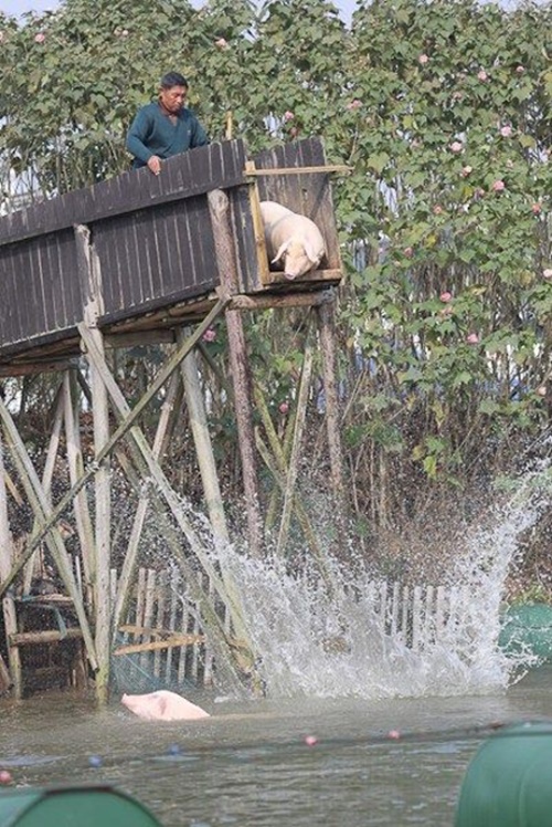 Thế nhưng anh Huang Demin, một nông dân nuôi lợn ở quận Ningxiang, tỉnh Hồ Nam, Trung Quốc, lại còn phô trương hơn khi xây hẳn một cái cầu nhảy cho lợn tập “phi” xuống hồ bơi dành riêng cho chúng.
