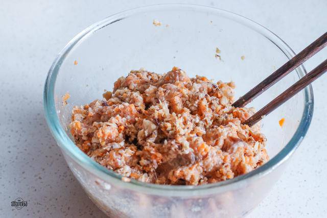 - Cho thịt xay vào bát, thêm một thìa rượu nấu ăn, một thìa nước tương nhạt, một thìa dầu hào, một thìa tiêu trắng, một thìa muối, một thìa dầu ăn, đảo đều theo một chiều để thịt ngấm đều gia vị.