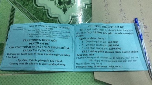 Theo đó, vào 20/6, nhóm người của công ty Sơn Hà đến ấp Lộc Bình (xã Lộc Thành), tổ chức hội thảo ra mắt sản phẩm. Họ phân chia nhau đi tới từng nhà, gõ cửa phát giấy mời với nội dung rất hấp dẫn như: “Tham dự ra mắt sản phẩm mới và tri ân, tặng quà khách hàng”, “Tất cả quý vị tới tham dự chương trình đúng giờ đều nhận được 10.000 đồng tiền mặt + 1 món quà trị giá 85.000 đồng. Ngoài ra, nhiều phần quà có giá trị khác từ 100.000 đồng đến 2.150.000 đồng. Chương trình chỉ dành cho độ tuổi từ 25 trở lên”...