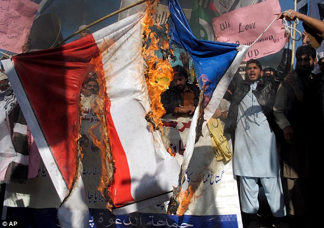Cờ của nước Pháp bị đốt cháy ở phía tây bắc thành phố Peshawar và trung tâm Multan. Các cuộc biểu tình cũng diễn ra tại thủ đô Islamabad và thành phố Lahore.