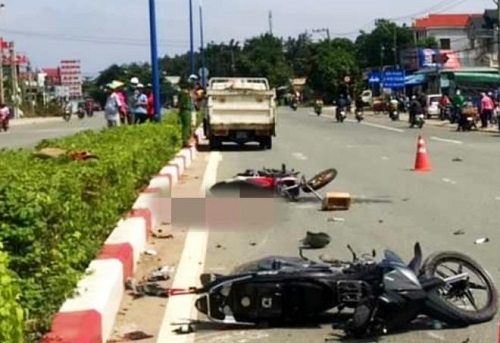 Cú tông mạnh khiến 2 xe máy trượt dài, văng về phía trước khoảng 5m. Người vợ khoảng 40 tuổi tử vong tại chỗ. Người chồng và nam thanh niên gây tai nạn được đưa đi cấp cứu trong tình trạng nguy kịch.
