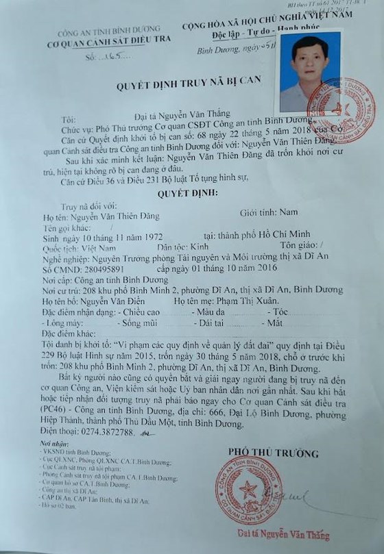 Ngày 6/7, cơ quan CSĐT Công an tỉnh Bình Dương đã công bố quyết định truy nã đối với Nguyễn Văn Thiên Đăng (46 tuổi, ngụ tại số 208, khu phố Bình Minh 2, phường Dĩ An, thị xã Dĩ An, Bình Dương) về tội "Vi phạm các quy định về quản lý đất đai".
