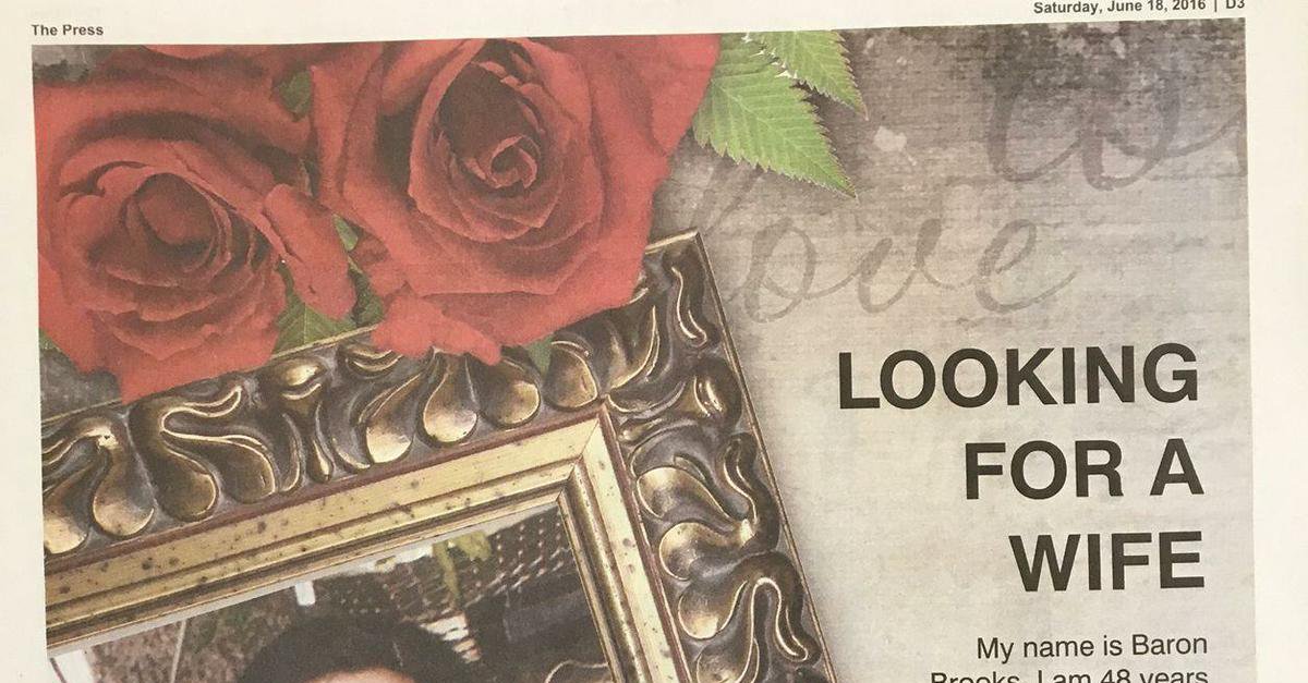 Theo đó, tờ quảng cáo được đăng ngày 8/6, đã giới thiệu Brooks là một người đàn ông 48 tuổi và trông giống như trong ảnh, chỉ trừ mái tóc xám, chưa kết hôn, đang tìm kiếm một người vợ có thể có con "càng sớm càng tốt".