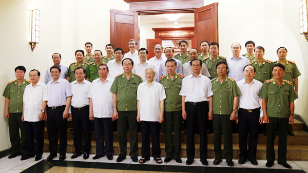 Các đồng chí trong Bộ Chính trị chụp ảnh lưu niệm với Ban Thường vụ Đảng ủy Công an Trung ương. |