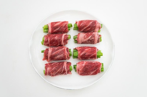 Cuộn 3 – 4 cọng đậu cô ve vào trong mỗi lát thịt bò rồi dùng bột ngô dính mép thịt.