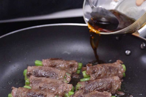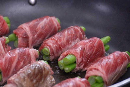 Đun nóng dầu ăn, cho thịt cuộn đậu cô ve vào chiên đến khi thịt chín.