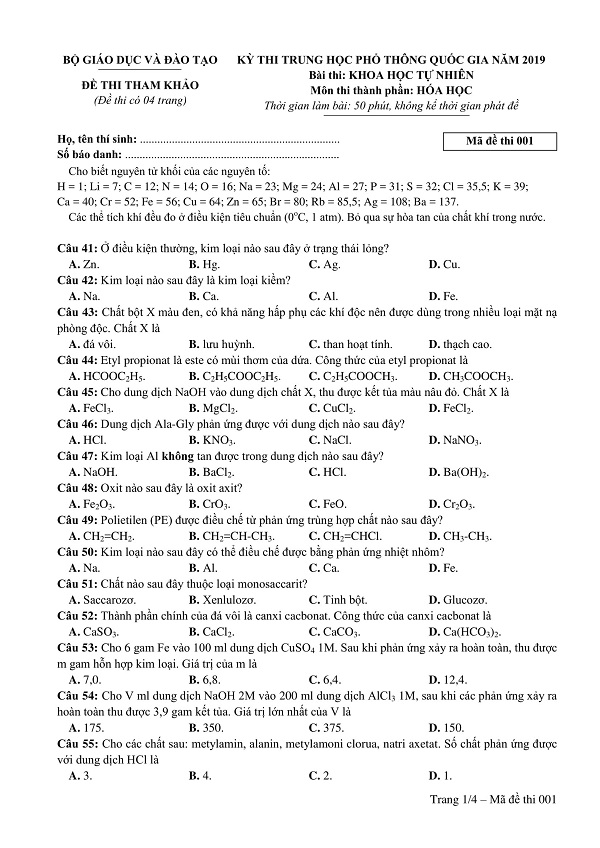Đề thi tham khảo THPT quốc gia 2019 môn Hóa học bao gồm 40 câu hỏi trắc nghiệm và thí sinh có 50 phút để hoàn thành bài thi của mình.