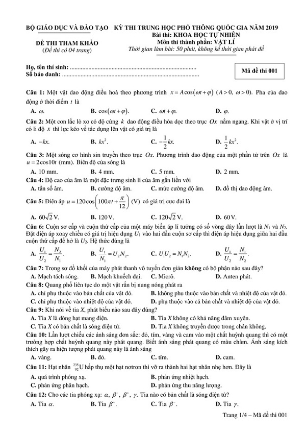 Đề thi tham khảo THPT quốc gia 2019 môn Vật lý |