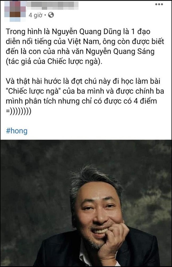 "Trong hình là Nguyễn Quang Dũng - một đạo diễn nổi tiếng của Việt Nam. Ông còn được biết đến là con của nhà văn Nguyễn Quang Sáng (tác giả của "Chiếc lược ngà"). Và thật hài hước là đợt chú này đi học làm bài "Chiếc lược ngà" của ba mình, được chính ba mình phân tích nhưng chỉ có được có 4 điểm", cụ thể bài đăng.