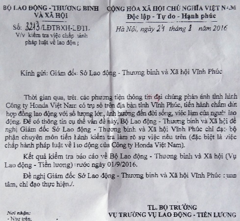 Nội dung văn nêu rõ: Để có thông tin cụ thể và đầy đủ, Bộ LĐ-TB&XH yêu cầu Giám đốc Sở LĐ-TB&XH Vĩnh Phúc chỉ đạo bộ phận chuyên môn tiến hành kiểm tra làm rõ sự việc nêu trên, đặc biệt là việc chấp hành pháp luật về lao động của Công ty Honda Việt Nam.