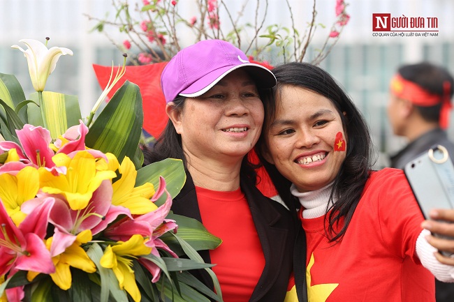 Đáp lại những tình cảm đặc biệt mà NHM dành tặng, mẹ cầu thủ Quang Hải cũng rất vui vẻ chụp ảnh với NHM. Ảnh: Người Đưa Tin |