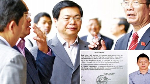 Ông Vũ Huy Hoàng (giữa) lúc còn làm Bộ trưởng (ảnh lớn) và con trai Vũ Quang Hải, cùng quyết định bổ nhiệm (ảnh nhỏ). Ảnh: Hồng Vĩnh |
