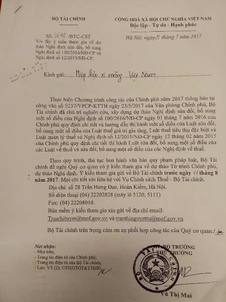 Theo đó, Bộ Tài chính đề nghị Hiệp hội xi măng Việt Nam và các cơ quan có liên quan lấy ý kiến tham gia về dự thảo Tờ trình Chính phủ, dự thảo Nghị định. Ý kiến tham gia gửi về Bộ Tài chính trước ngày 11/8.