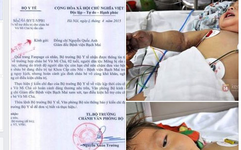 "Hiện cháu bé đang điều trị tích cực tại Khoa Cấp cứu Nhi - Bệnh viện Bạch Mai trong tình trạng nguy kịch, nhưng hoàn cảnh gia đình cháu bé vô cùng khó khăn, nghèo khổ không có điều kiện chữa trị. Bằng tình cảm chân thành nhất, tôi chia sẻ với gia đình về tình trạng sức khoẻ của cháu Vừ Mi Chá”, người đứng đầu Bộ Y tế cho biết.
