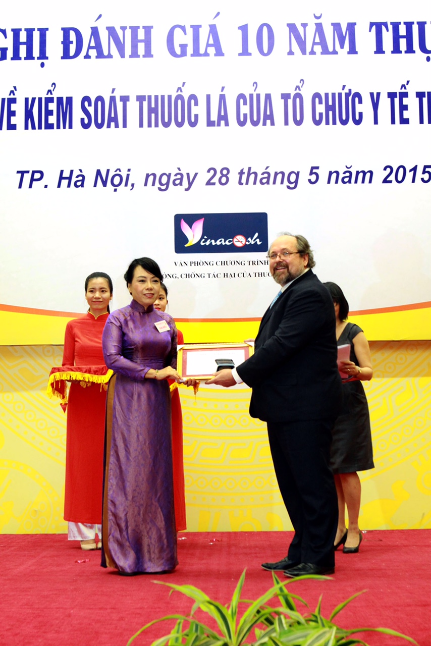 Ngày 28/5/2015, tại Hội nghị đánh giá 10 năm thực hiện công ước Khung về Kiểm soát thuốc lá của Tổ chức Y tế Thế giới, trưởng đại diện Tổ chức Y tế thế giới tại Việt Nam đã trao giải thưởng danh dự cho PGS.TS Nguyễn Thị Kim Tiến Bộ trưởng Bộ Y tế, Chủ nhiệm Chương trình Phòng chống tác hại thuốc lá Quốc gia vì những đóng góp to lớn của Bà trong công tác Phòng chống tác hại của thuốc lá.