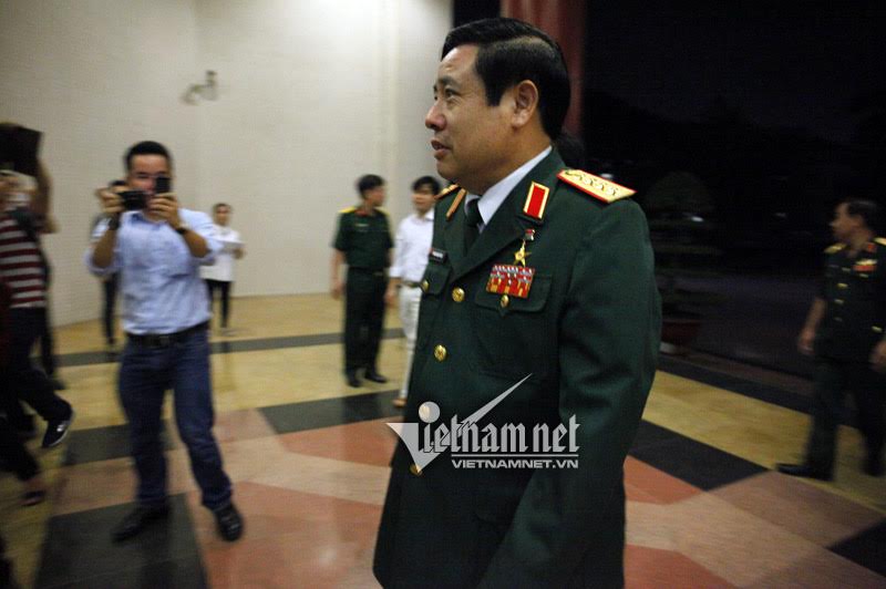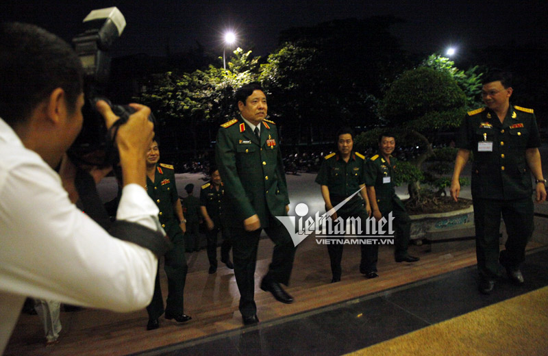 19h30 tối ngày 27/7, Bộ trưởng Phùng Quang Thanh xuất hiện tại hội trường Bộ Quốc phòng, đi lại nhanh nhẹn, khỏe khoắn.