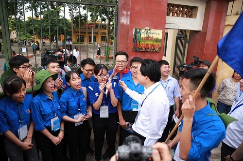 Bộ trưởng trò chuyện, khích lệ tinh thần các bạn trẻ tham gia tiếp sinh trong kỳ thi THPT quốc gia 2018. Ảnh: Lao Động |
