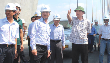 | Bộ trưởng Đinh La Thăng kiểm tra tiến độ và chất lượng cầu Nhật Tân. |