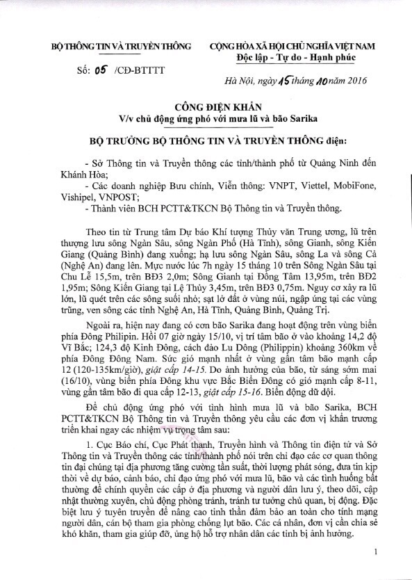 Công điện khẩn của Bộ trưởng Bộ TT&TT về việc chủ động ứng phó với mưa lũ và bão Sarika. |