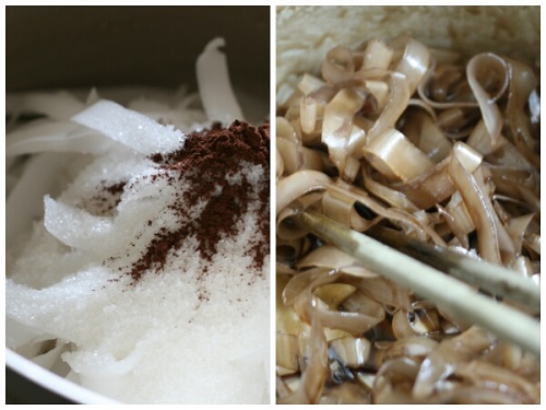 – Sên đến khi nước đường bắt đầu cạn và hơi keo, bạn nên chỉnh lửa tới mức nhỏ nhất và đun riu riu, vào lúc này phải đảo đều tay và liên tục. Đến khi thấy bên ngoài mứt dừa có phủ một lớp một bột màu cà phê thì tắt bếp.