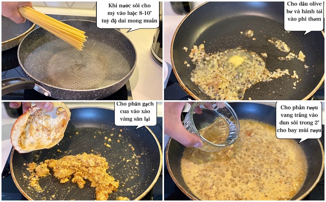 Cho phần rượu vang trắng vào và đun sôi khoảng phút cho mùi rượu bay hết. Sau đó cho nước luộc cua, single cream, tomato paste vào khuấy đều và đun cho cạn đi còn lại khoảng 80%. Sau đo cho tiếp phần Parmesan Cheese bào vụn vào và khuấy cho tan cùng nước sốt.