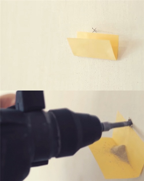 Khi cần khoan một lỗ trên tường mà không muốn bụi vữa rơi khắp nhà, trước khi khoan, bạn hãy đánh dấu vị trí cần khoan, sau đó dán một miếng giấy sticker ngay bên dưới vị trí đóng dấu rồi gập giấy lên một nửa. Như thế, khi khoan, vữa sẽ rơi hết lên giấy, bạn chỉ cần túm giấy lại, lột ra khỏi tường rồi cho vào sọt rác.