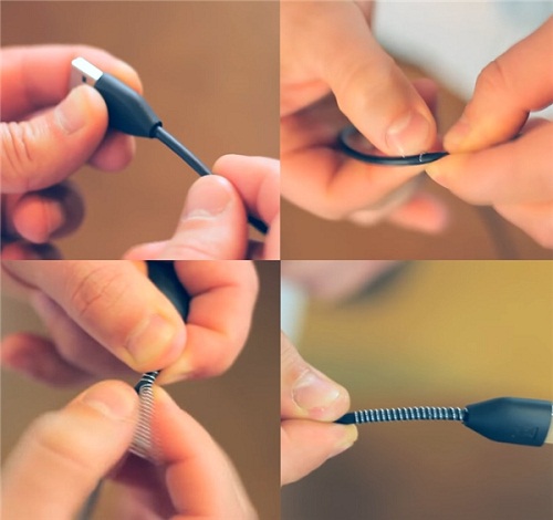 Để cho sợi dây sạc điện thoại không bị đứt ngay phần tiếp giáp với đầu cắm, bạn hãy xỏ vào đó một chiếc lò xo bên trong ruột bút bi. Cách xỏ rất đơn giản: móc một đầu của lò xo vào sợi dây rồi từ từ vặn lò xo theo cùng chiều với đường trôn ốc của nó, chiếc lò xo sẽ chẳng mấy chốc khắc nhập vào sợi dây.