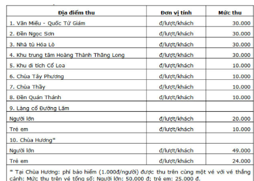Trước đó, năm 2015, trên địa bàn Hà Nội, UBND TP Hà Nội cũng quy định mức thu phí tham quan danh lam thắng cảnh, di tích lịch sử, công trình văn hóa trên địa bàn TP.Hà Nội, như Văn Miếu - Quốc Tử Giám, Đền Ngọc Sơn, Khu Di tích Cổ Loa, Đền Quán Thánh, Di tích Nhà tù Hỏa Lò, Khu Trung tâm Hoàng Thành Thăng Long, Chùa Thầy, Chùa Tây Phương, Chùa Hương, Làng cổ Đường Lâm… Vầ thực tế cho thấy dù đã thực hiện được hơn 2 năm nhưng vẫn có những ý kiến trái chiều xung quanh câu chuyện thu phí tham quan ở những địa chỉ kể trên.
