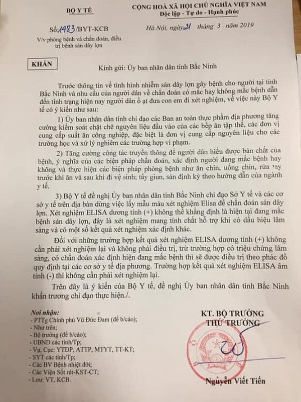 Chiều 21/3, Thứ trưởng Thường trực bộ Y tế Nguyễn Viết Tiến đã ký công văn khẩn gửi UBND tỉnh Bắc Ninh đề nghị dừng lấy mẫu xét nghiệm ELISA để chẩn đoán sán dây lợn.