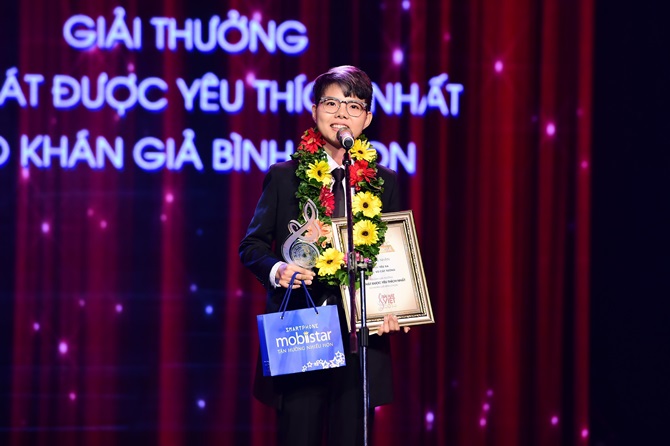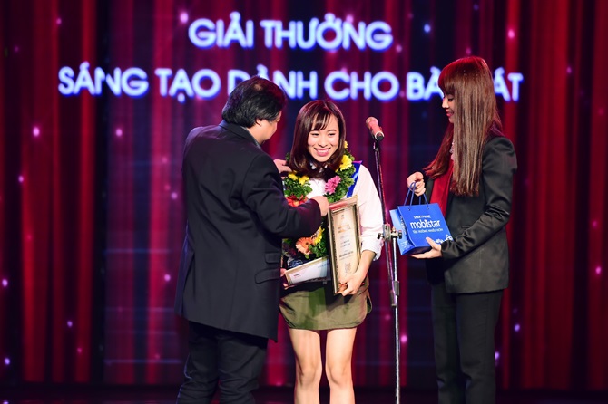 Sau 2 lần nhận giải, Vũ Cát Tường tiếp tục lên sân khấu để nhận giải thưởng Đam mê và sáng tạo do ông Ngô Nguyên Kha – Giám đốc điều hành của hãng điện thoại Mobiistar và á hậu 2 Diễm Trang xướng tên và trao tặng. |