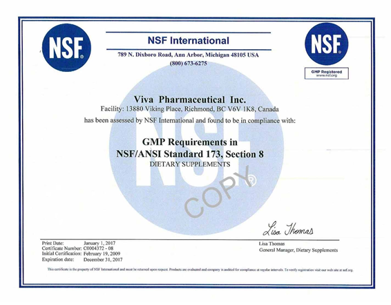 Nhà máy Viva Group đã được chứng nhận đạt tiêu chuẩn GMP ( thực hành tốt sản xuất thuốc) của tổ chức y tế thế giới WHO, Bộ Y Tế Canada và FDA Hoa Kỳ (cục quản lý thực phẩm và dược phẩm Hoa Kỳ)