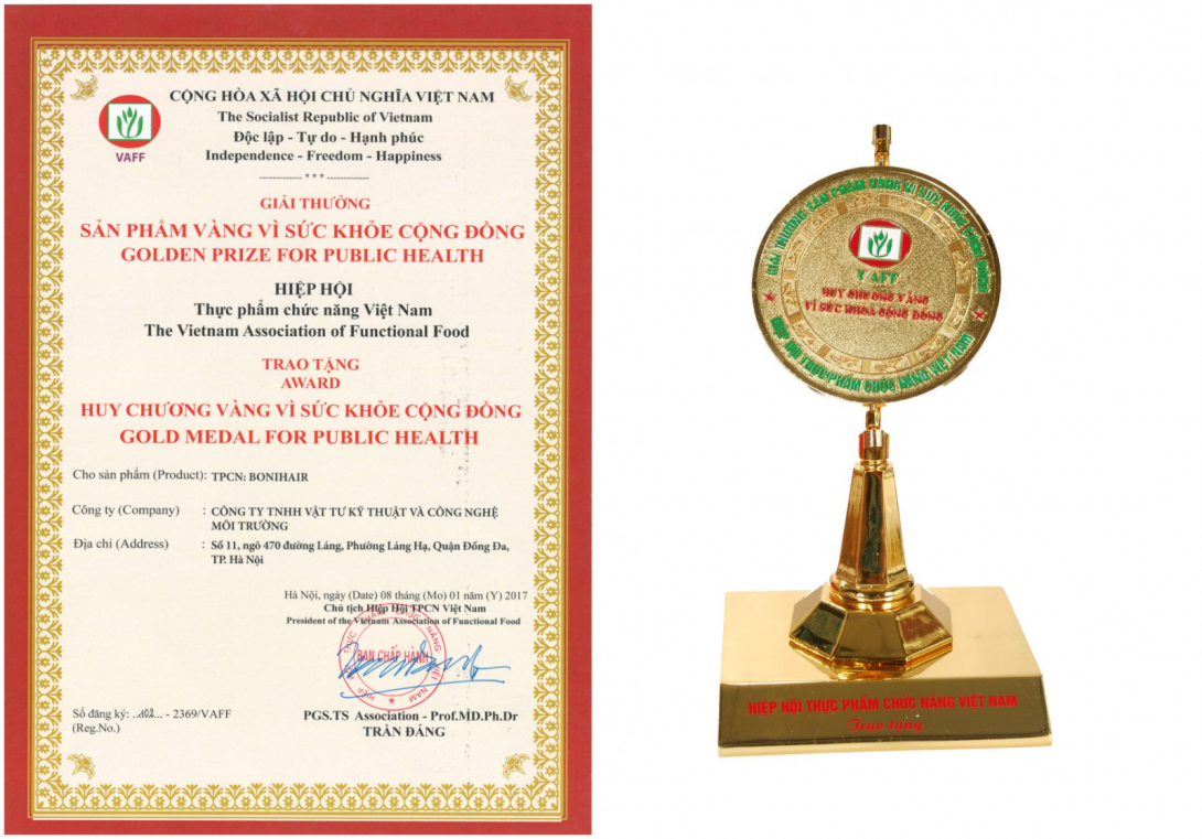 Năm 2017, BoniHair xuất sắc vượt qua hàng ngàn các sản phẩm khác để vinh dự được nhận giải thưởng “Huy chương vàng vì sức khỏe cộng đồng” do chủ tịch VAFF trao tặng. Giải thưởng là niềm tin, là sự công nhận không những của người tiêu dùng mà còn của các cơ quan chức năng, những hiệp hội uy tín với sản phẩm BoniHair.