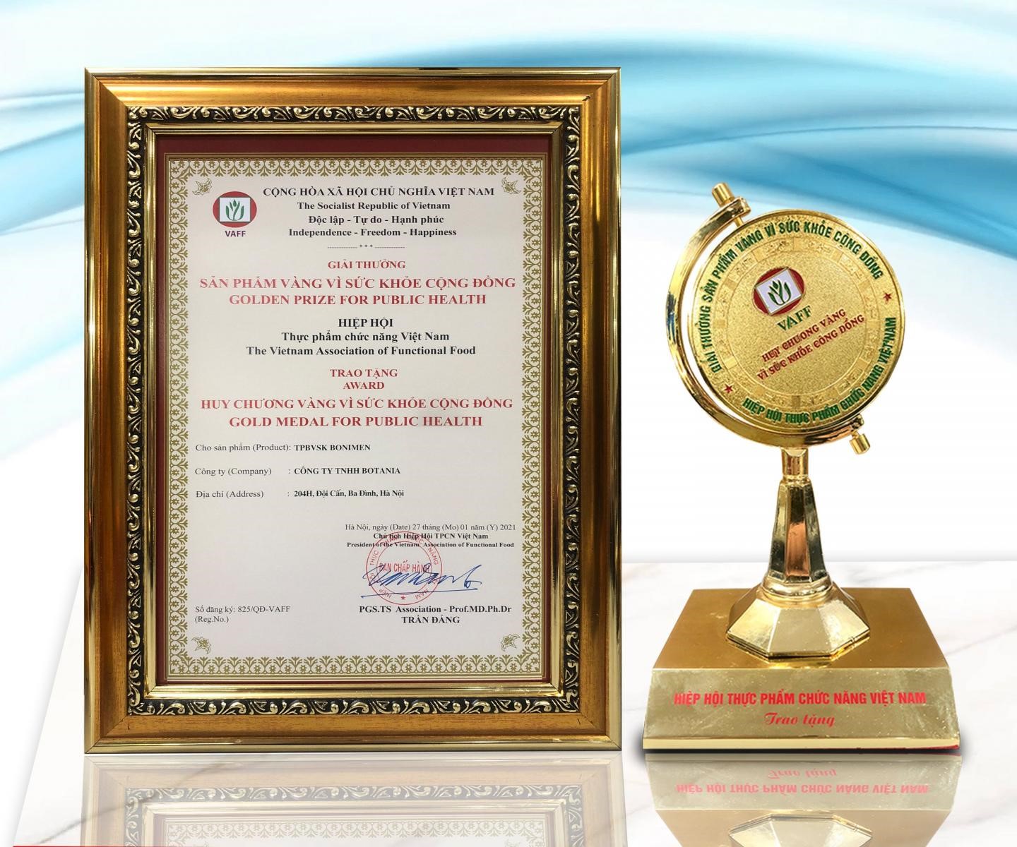 Nhờ những đóng góp cho sức khỏe cộng đồng, sản phẩm BoniMen vinh dự đạt giải thưởng "Sản phẩm vàng vì sức khỏe cộng đồng" do PGs.Ts Trần Đáng - Chủ tịch Hiệp hội thực phẩm chức năng Việt Nam trao tặng năm 2017 và 2021.