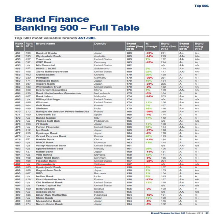 ![]() Vị trí xếp hạng của Vietcombank trong bảng đánh giá “Banking 500 - The most valuable banking brands of 2015” của Brand Finance. |
