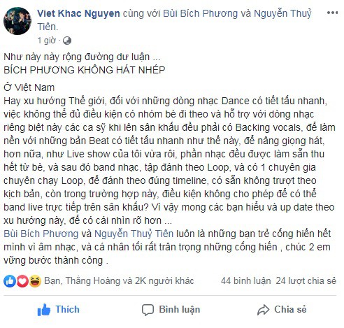 Đặc biệt hôm 3/10 vừa qua, Khắc Việt đã đăng tải một bài viết khá dài trên trang cá nhân với nội dung khẳng định Bích Phương không hát nhép.