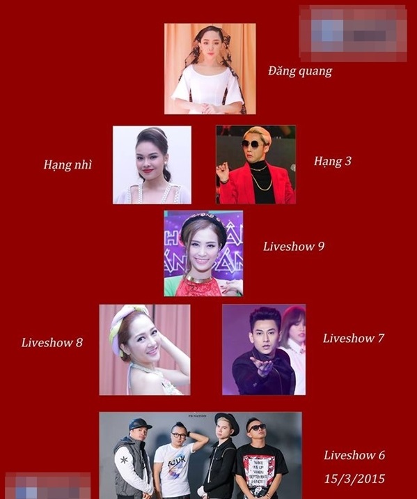 Mới đây, cộng đồng mạng bất ngờ truyền tay nhau hình ảnh được cho là bảng xếp hạng chung cuộc của các thí sinh tham gia The Remix gây xôn xao dư luận. Theo thông tin trên hình, Tóc Tiên sẽ trở thành Quán quân cuộc thi này. Giang Hồng Ngọc cũng "vượt mặt" Sơn Tùng M-TP để trở thành Á Quân, còn chàng ca sỹ sinh năm 1994 đến từ Thái Bình chỉ đứng ở vị trí thứ 3.