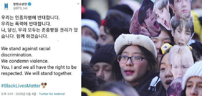 Cách đây không lâu, hãng tin Yonhap dẫn nội dung đăng tải trên trang Twitter chính thức của BTS ngày 4/6: “Chúng tôi chống lại sự phân biệt chủng tộc. Chúng tôi lên án bạo lực. Bạn, tôi và tất cả chúng ta đều có quyền được tôn trọng. Chúng ta sẽ sát cánh cùng nhau”.