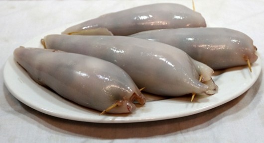 Bóp mực với chút rượu gừng để khử mùi tanh, rửa sạch, ướp 1/2 thìa cà phê bột canh, xoa đều trong và ngoài con mực, để 15 phút cho ngấm.