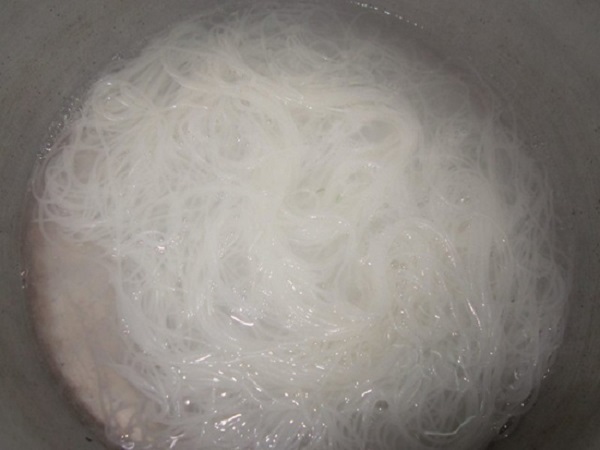 - Bước 1: Cho nước vào nồi đun sôi, thêm bún vào chần sơ, đổ ra rổ ráo nước rồi chia bún vào 4 tô.