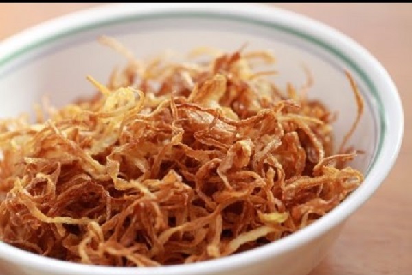 - Bước 3: Làm nóng chảo với 5 muỗng canh dầu ăn, cho hành tím vào phi thơm vàng, vớt hành tím ra rây cho ráo dầu.