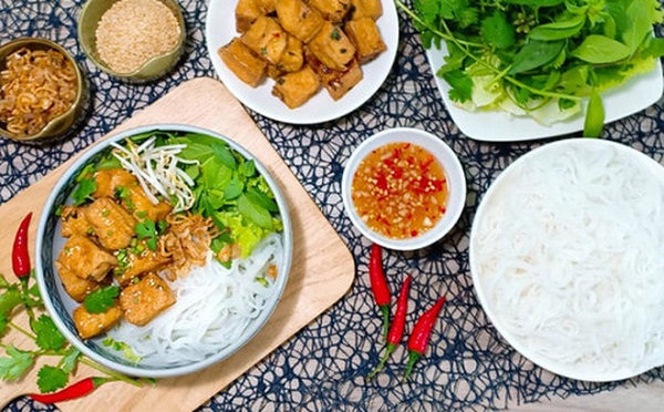 Cắt xà lách, húng quế, ngò rí lên các tô bún, thêm giá sống. Gắp đậu lên sao cho đẹp mắt. Thêm hành tím phi vàng và mè rang. Chan nước mắm chua ngọt và thưởng thức ngay hay để nguội mới dùng đều ngon.