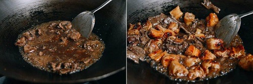 Thêm một chút nước, nước tương, giấm gạo vào đảo đều rồi đun sôi. Tiếp theo đổ thịt bò vào.