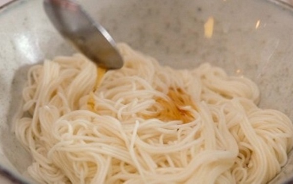 - Bún khô luộc chín, vớt ra bát rồi cho ít dầu mè vào trộn đều, để sang một bên.