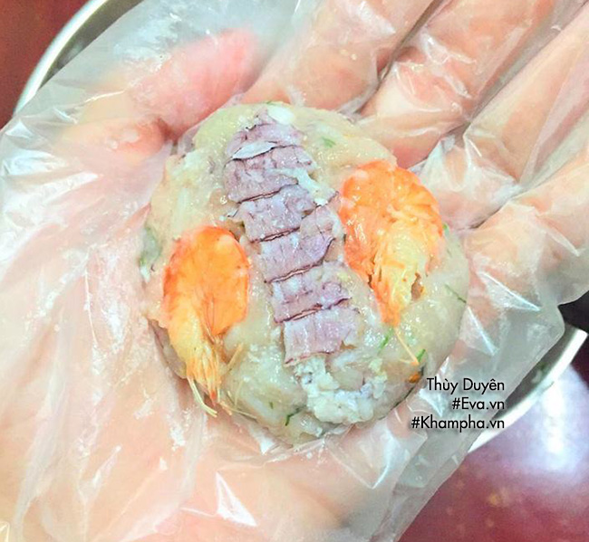 Bước 2: Đeo bao tay nilon, xoa chút dầu ăn rồi lấy từng chút chả từ âu ra nặn dẹt vừa miếng ăn, đặt bề bề và tôm nõn vào chính giữa miếng chả. Cứ làm lần lượt như vậy cho đến khi hết lượng chả trong âu.