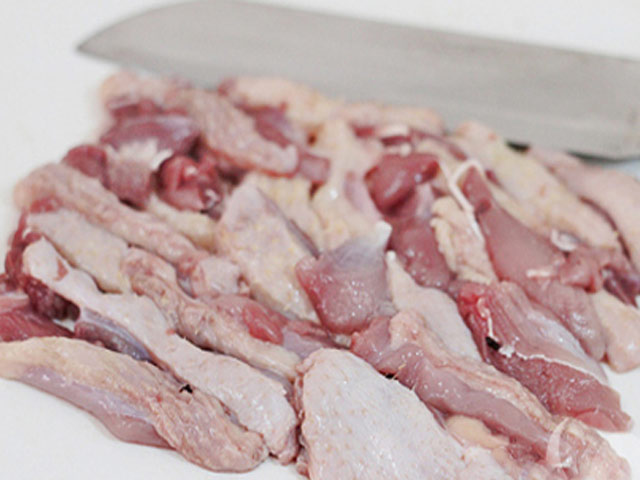 Sau khi làm sạch, tiến hành chặt vịt theo từng miếng thon dài vừa phải. Không nên chặt miếng to như thịt gà vừa khó chín vừa không ngấm đều được gia vị.