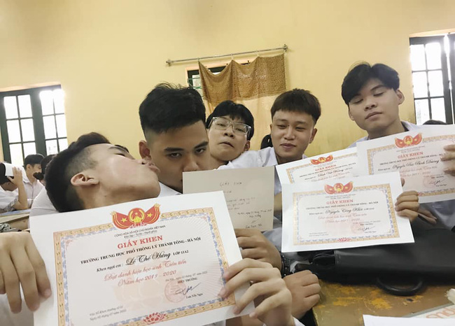 Bức ảnh cả lớp giơ giấy khen, duy nhất một học sinh không được giấy khen. |