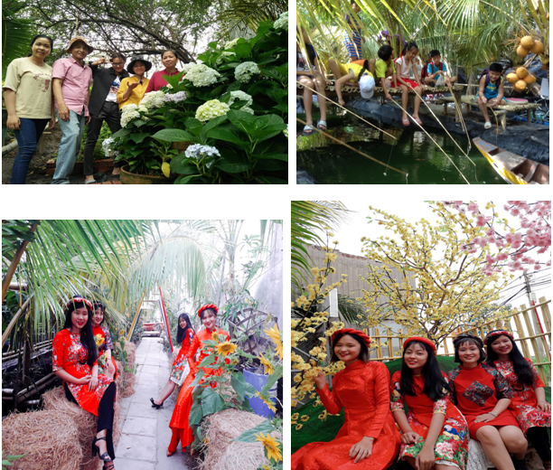 Tới đây du khách còn được trải nghiệm đi cầu tre tình yêu "Dài nhất Đông Nam Á". Hái rau, câu cá tại vườn. Các bạn nhỏ thì được tắm hồ bơi có mưa nhân tạo. Đặc biệt du khách còn được thưởng thức gần 30 món ăn uống trong combo tự chọn dân dã bánh dân gian hương vị miền tây; bánh nắn lá, bánh tét, bánh chuối nước cốt dừa, bánh ít nhân dừa, bánh da lợn, rau câu dừa, khoai mì nước cốt dừa, ổi trái, cam vườn, dưa hấu và uống nước dừa tươi rất mát....