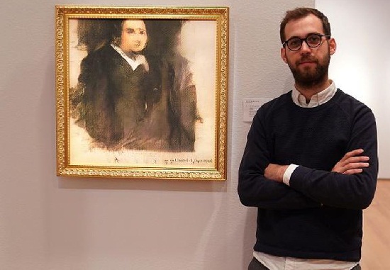 Một thành viên của nhóm nghiên cứu chụp ảnh cạnh bức tranh được vẽ từ trí tuệ nhân tạo. (Ảnh: Getty) |